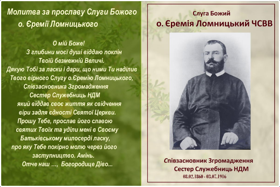Дякую Тобі за ласки і дари, що ними Ти наділив Твого вірного Слугу отця Єремію Ломницького, Співзасновника Згромадження Сестер Служебниць Непорочної Діви Марії, який віддав своє життя як свідчення віри задля єдності Святої Церкви.