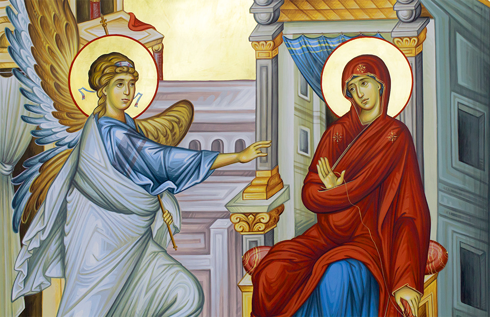 Після того, як Марія була заручена з Йосифом, з’явився до неї архангел Гавриїл і сказав: «Радуйся, благодатна, Господь з тобою» (Лк. 1, 28); «Зачнеш у лоні і породиш сина і назвеш його Ісус. Він буде великий і Сином Всевишнього назветься, і дасть йому Господь Бог престіл Давида, батька його, і царюватиме над домом Якова повіки та й царству його не буде кінця». Марія ж сказала: «Як же це станеться, коли я мужа не знаю». Відповів архангел: «Дух Святий найде на тебе й сила Всевишнього окриє тебе, — тим-то й Святе, що народиться, назветься — Син Божий. У Бога нема неможливого». І сказала Марія: «Я раба Господня, нехай буде мені по твоєму слові» (Лк. 1, 31-38).
