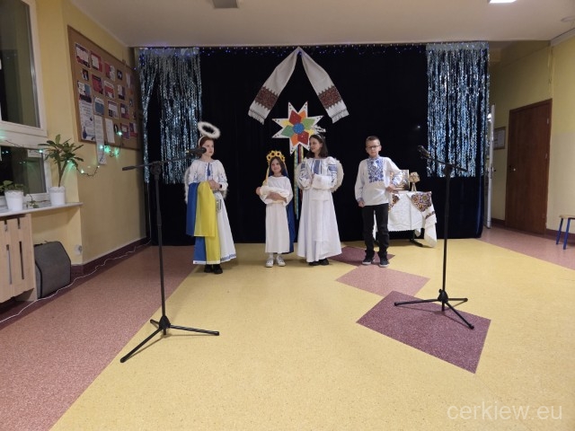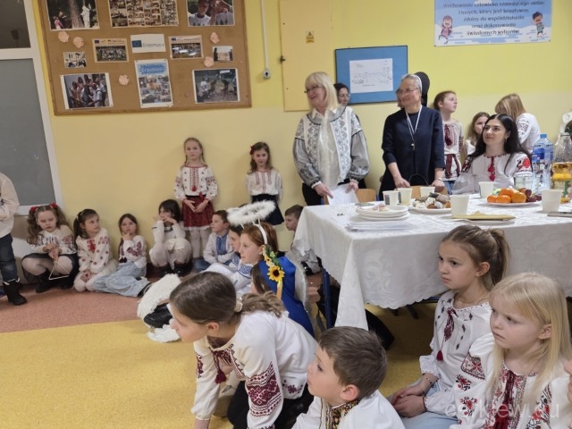 Після молитви почесні гості: владика Аркадій Трохановський та віце-президент міста Гданськ пані Моніка Хабіор звернулися з теплими словами до батьків та дітей. Влдаик Аркадій побажав усім миру та щоб ми колядували з Україною та для України і щоб цей наш голос почули всі, бо коли колядуємо то Україна існує та триває. З черги пані віце-президент сказала: Перепрошую Вас українці, що досвідчуєте такого зла.