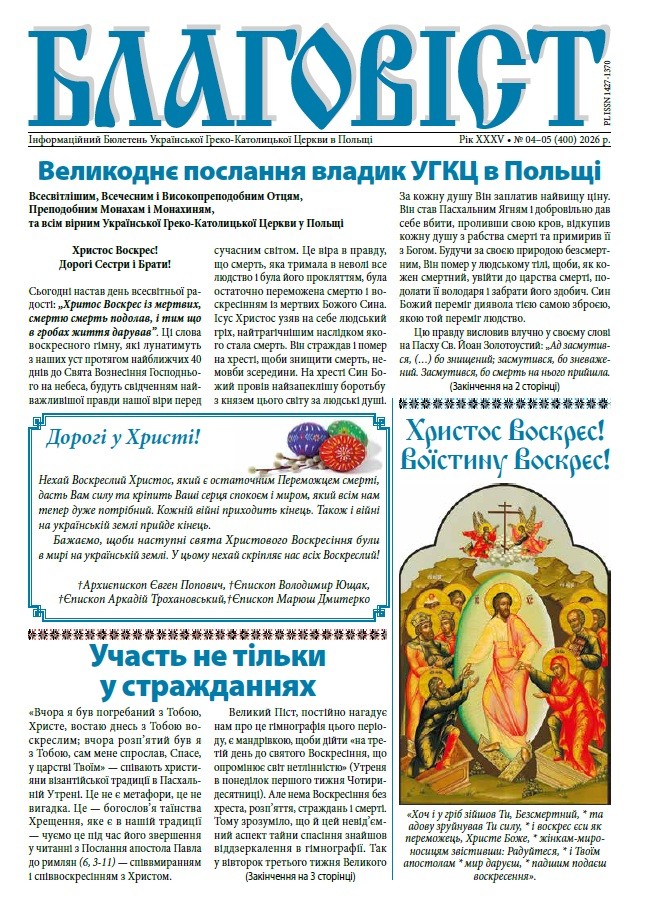Подаємо до Вашої уваги, що вийшов друком святковий, великодній [Рік XXXV • № 04–05 (400) 2026 р.] номер нашого церковного часопису – «БЛАГОВІСТ».